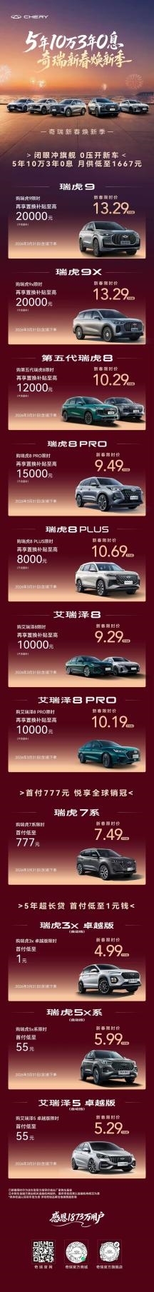 紧扣用户新春购车需求,奇瑞精准宠粉、诚意让利。优惠覆盖燃油、新能源全品类车型,为消费者提供多元化选择空间,让每一位消费者都能以亲民价格,享受到越级产品体验。